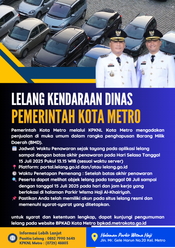 Pemerintah Kota Metro melalui KPKNL Kota Metro mengadakan penjualan di muka umum dalam rangka penghapusan Barang Milik Daerah (BMD).
