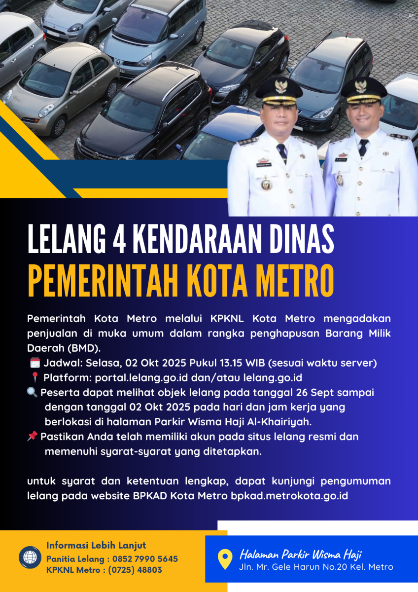 Pemerintah Kota Metro melalui KPKNL Kota Metro mengadakan penjualan di muka umum dalam rangka penghapusan Barang Milik Daerah (BMD).